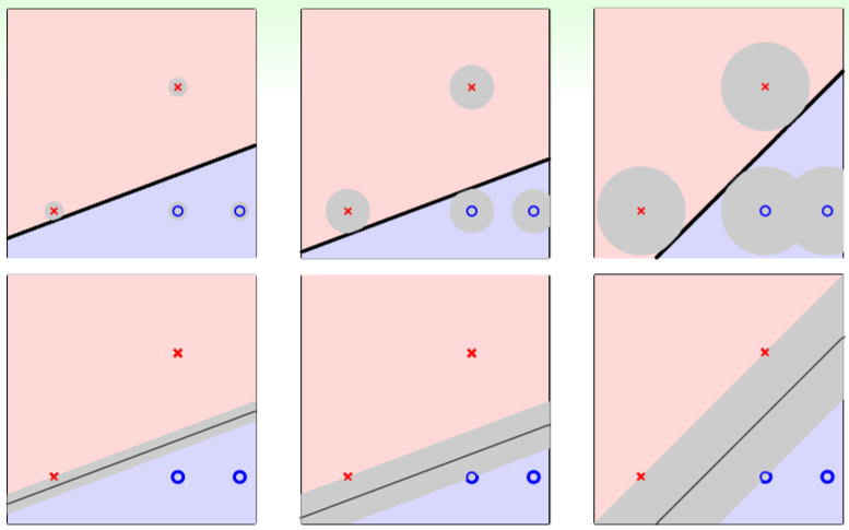 从上图来看,显然最右边这一列是比较合理的分割方法。也就说,离分类线的最近的点要尽可能的远,这样对各种噪音误差的兼容性是最好的。 用数学的定义来说就是: \[max_{w}min_{n=1...N}distance(x_n, w)\]