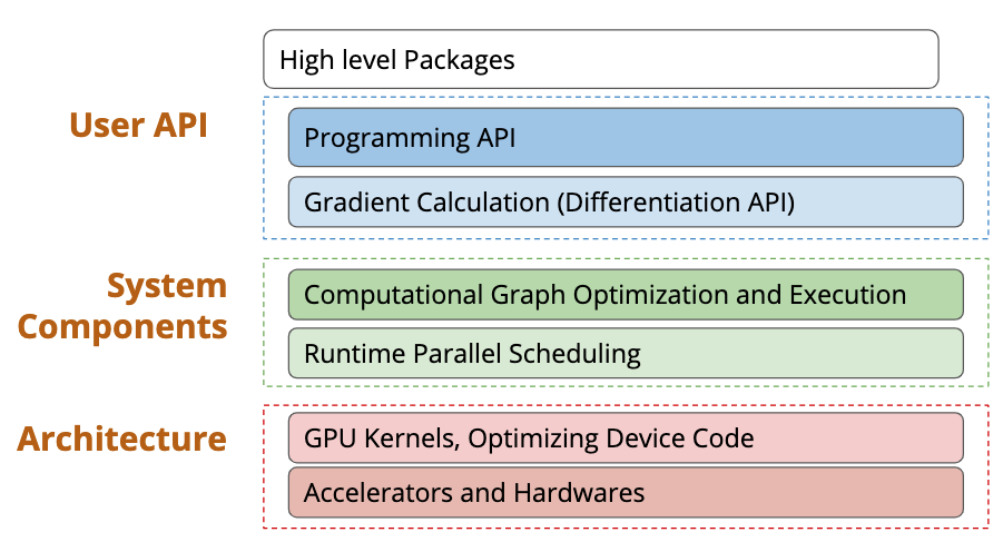 学习过什么是 Deep Learning 了,那么啥是 Deep Learning System 呢? 在我的理解其实就是从调包到真正计算出结果的全过程,就是 Deep Learning System,也就是通常所说的算法的真正落地。 在这个课程中,Deep Learning System 从高层到底层分成了三个部分:
