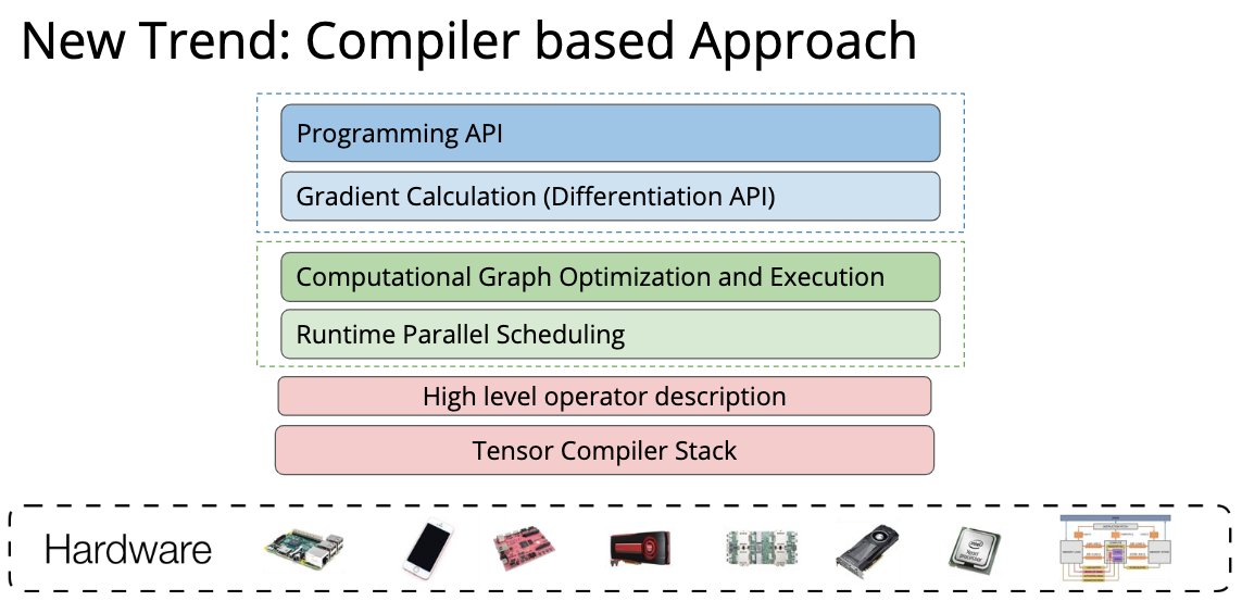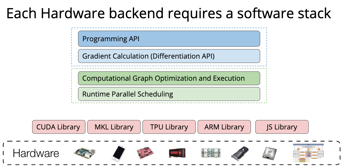 然后简单介绍一下最底层的情况,我们训练完了 model,要部署到不同的设备上。想必大家也都听过各种各样的厂商搞出过各种各样的部署方法,为了产生更好的模型性能: