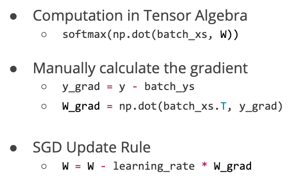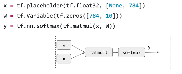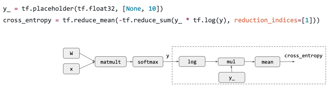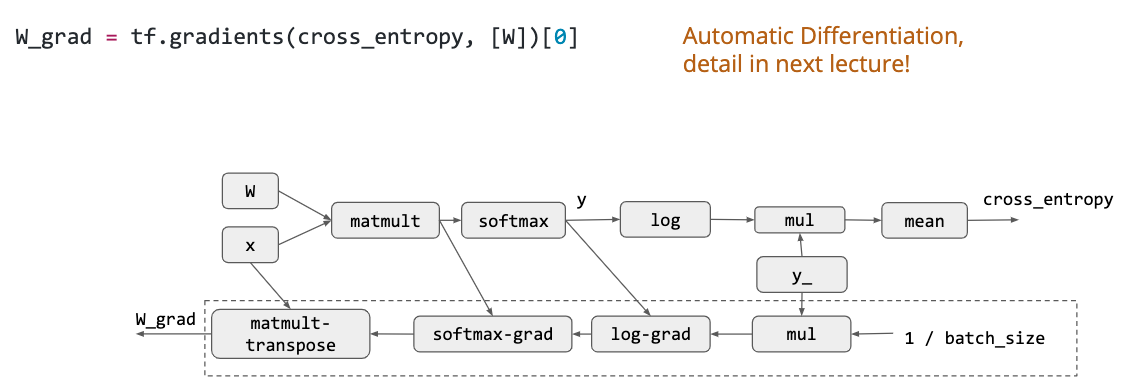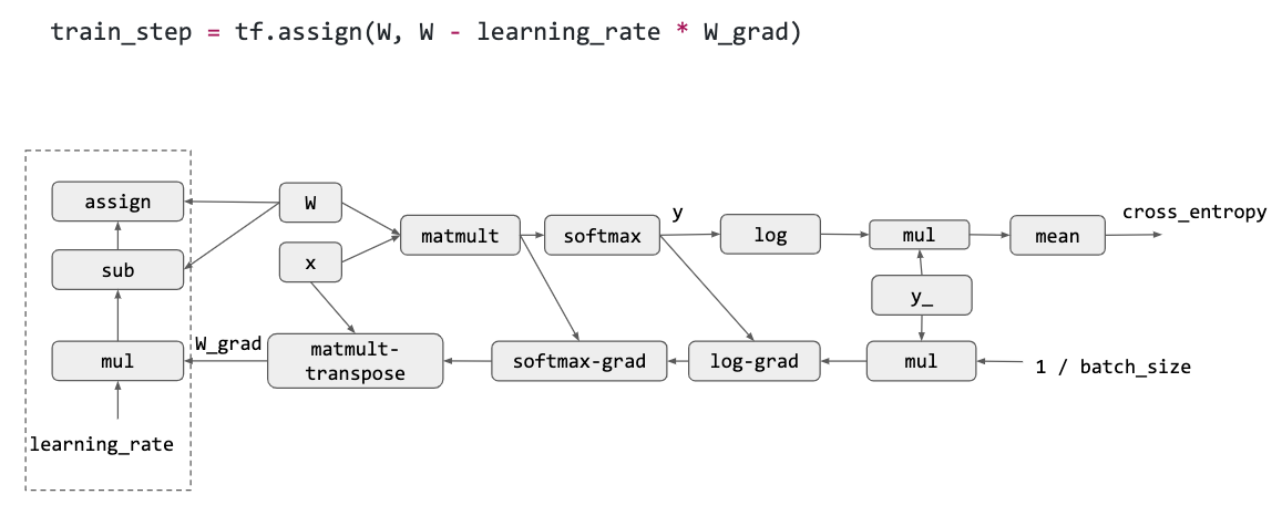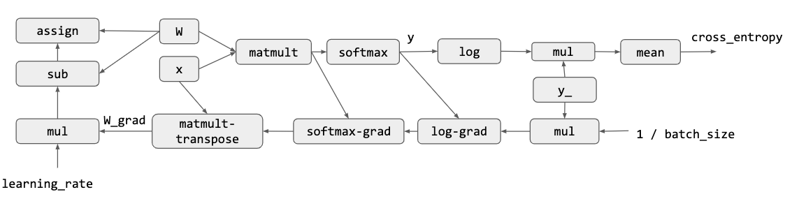 计算图是一个 Deep Learning 框架的基本概念,节点表示运算操作,边表示数据依赖,这里展示了一个最简单的 Logistic Regression 计算图实例: 首先是计算 loss 之前的前向传播,其实就是一个最简单的矩阵乘法加一个 softmax: