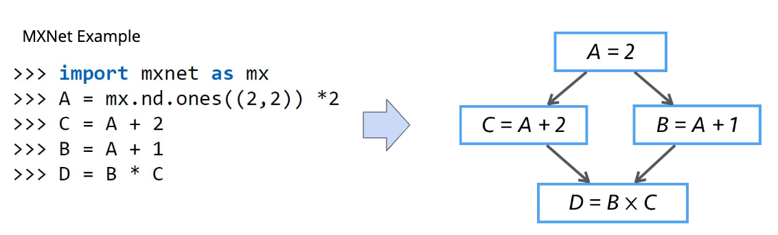 最上层的 API 做了最简单的介绍,下面就是中间的 System 部分,讲的是对计算图的优化和对计算的调度。 计算优化最简单的一种就是 memory 优化,比如增加 cache 利用率之类的。因为我们的代码通常跑在多个线程甚至多个计算设备上面,所以并行调度也是非常重要的。最简单的一种并行调度如下图,这是一个 mxnet 代码,因为计算 C 和计算 B 是完全独立的,所以这两个部分可以并行化。