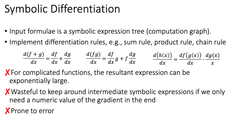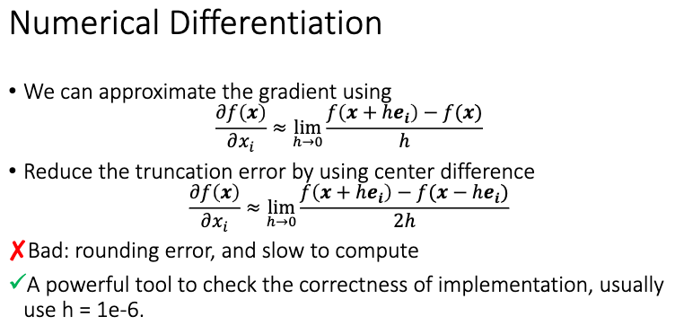 通过程序来维护整个求导的式子,然后把变量带入就得到最终的导数。这种做法的缺点在于表达式是一个很难维护的东西,最后要维护的东西就会越来越多。正常 Deep Learning 框架显然不应该选择这种求导方式... 第二种叫做 Numerical Differentiation,这种求导形式非常简单,看起来很适合计算机: