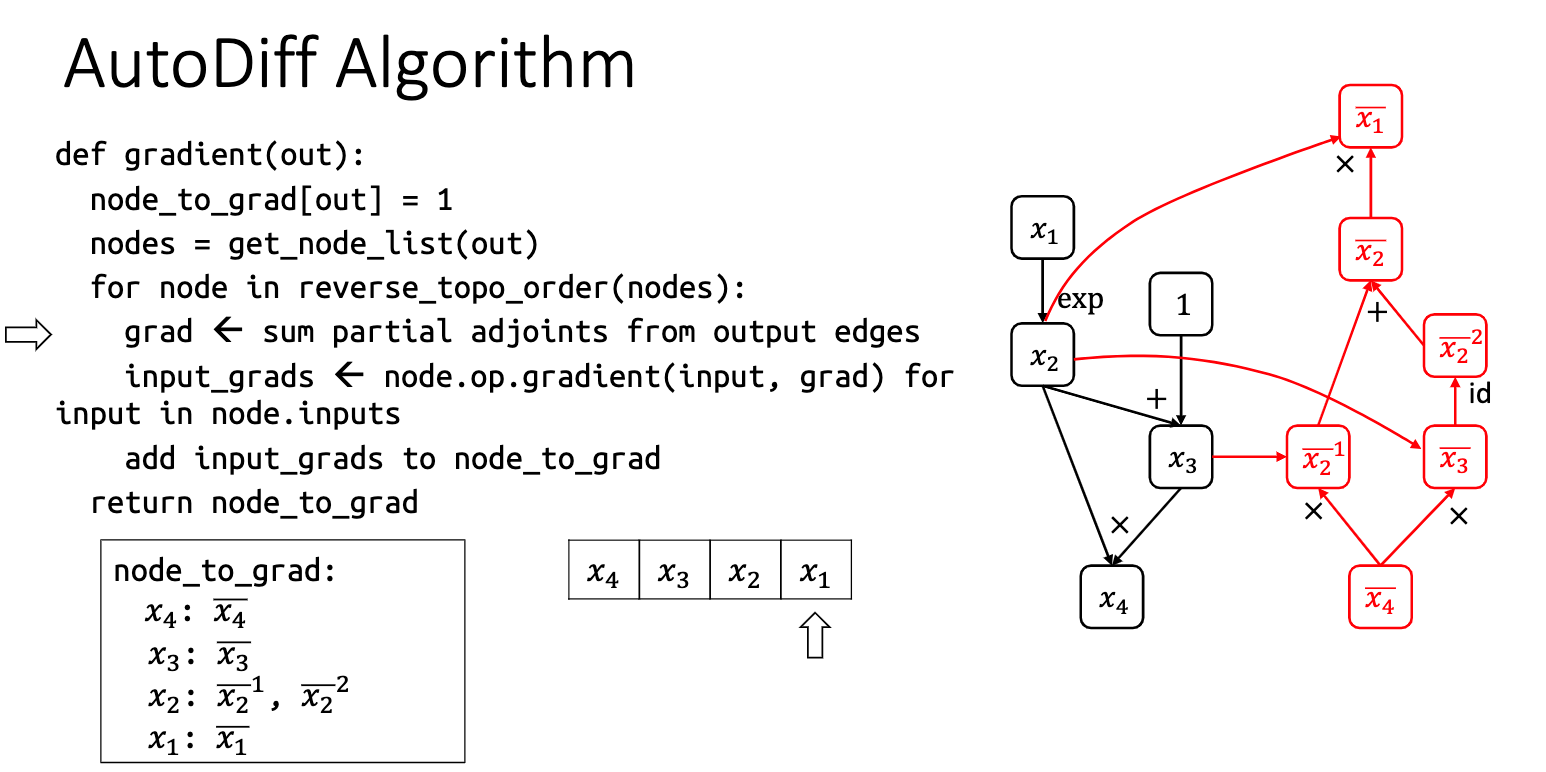 其实思路非常简单,看伪代码就看的出来。这种方法就是通过反拓扑序去生成一个反向的计算图,因为是计算图所以不用保存任何中间变量;也因为是计算图,所以可以进行通用的并行化与代码优化,两全其美! 接下来就是 Auto-diff 的具体实现,也就是 assignment 1。这次作业的难度不是太大,前面就是一些算子的简单实现,后面有两段重要的代码: