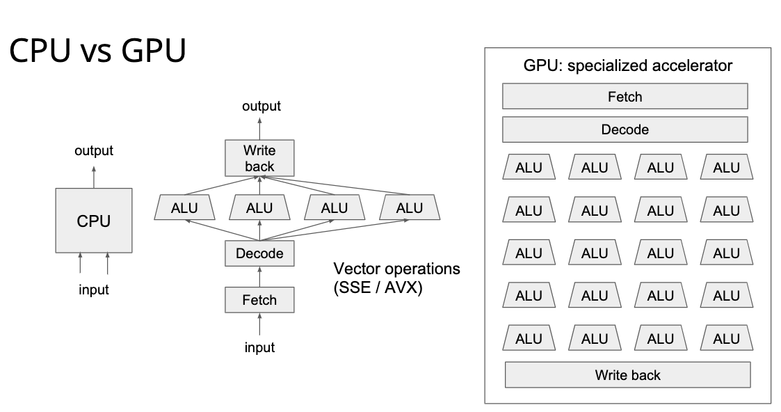 而 GPU 则是给 CPU 加了一大堆计算资源,比普通的指令向量化更加强劲: