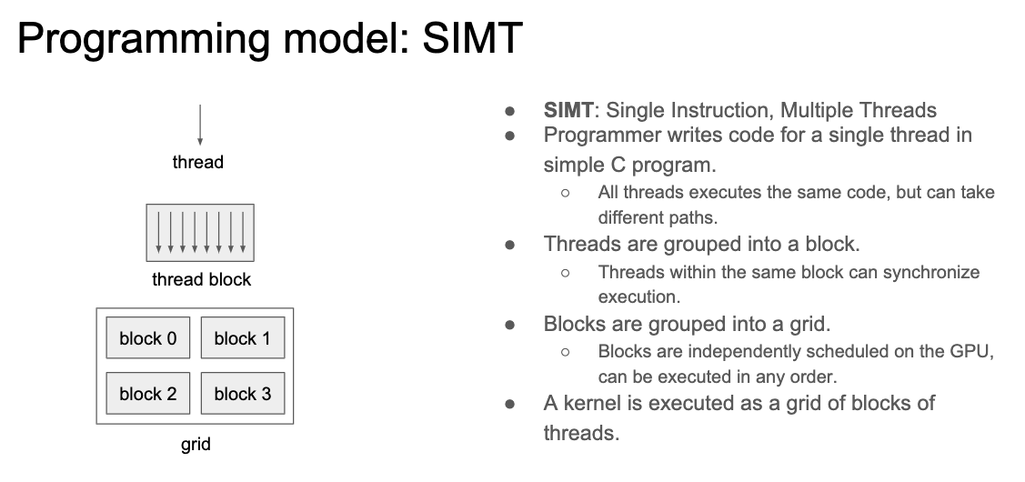 然后讲了 CUDA Programming Model,因为我完全不懂 CUDA 编程,所以后面的东西都是我瞎理解的,不一定对。 这个叫做 SIMT 的 Model 就是把几个 thread group 成一个 block,再把几个 block group 成一个 grid,block 可以以任何顺序在 GPU 上面调度。