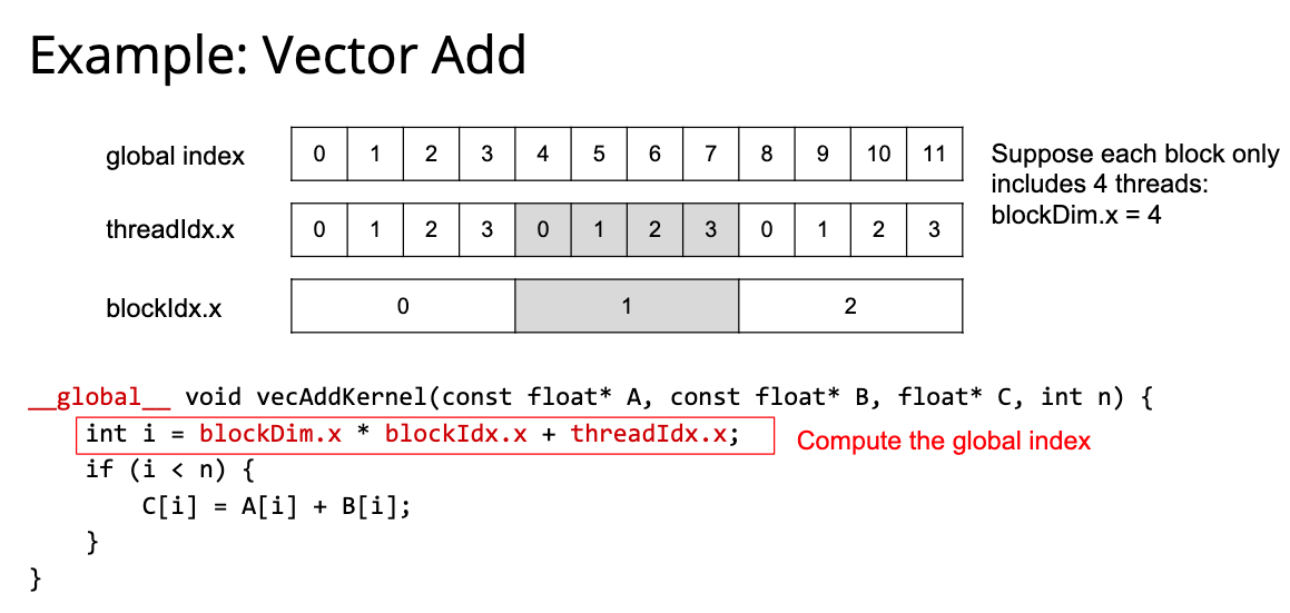 然后是个最简单的 cuda 程序——vector add。过程非常简单,跟操作系统里面查页表差不多,这里通过 block 下标和 thread 下标可以得到向量加法的下标,然后每个线程都执行一样的代码就可以了。