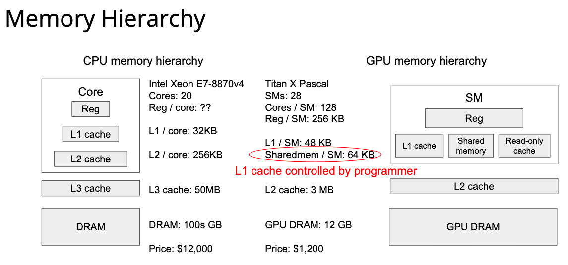 这一讲涉及到的部分比较底层,虽然浙大本科的硬件三连质量非常高,但是对于 GPU 架构接触还是非常少的,又没有视频,只能尽力看一看了... 首先讲的是 CPU 的架构,很容易理解,CPU 跟内存有关的操作都很慢,所以才有各种指令预测、cache 优化算法之类的折磨着一代有一代的计算机学子: