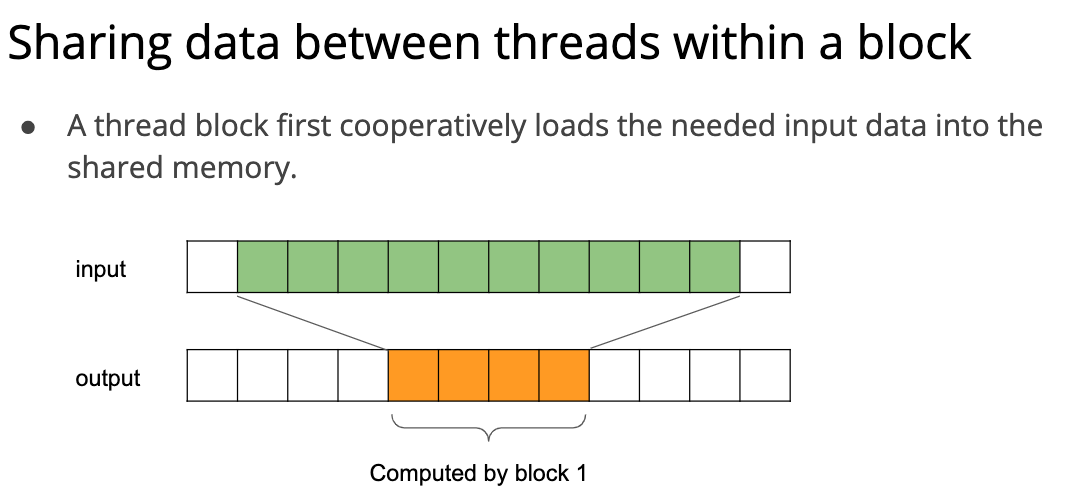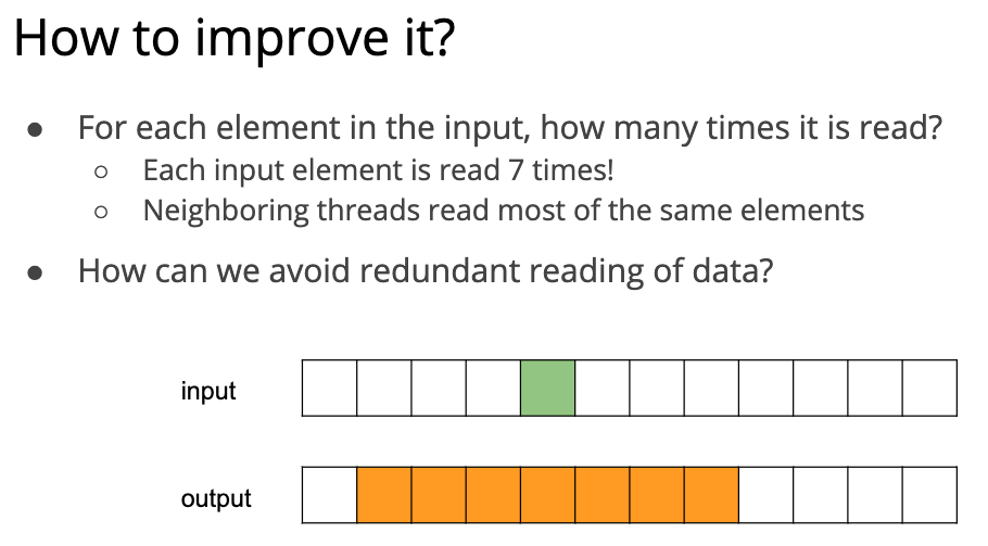 为什么说他图画的不太好,因为他的图跟代码的下标其实是对应不上的。B[0] 的结果应该是从 A[0] 到 A[6] 的和才对,这样下标就和代码完全对应上了。 这个实现非常简单,所以有很大的优化空间。其中最脑残的地方就是每个线程都读了 7 次 A,这样对 GPU 这种小 cache 来说是非常残忍的。