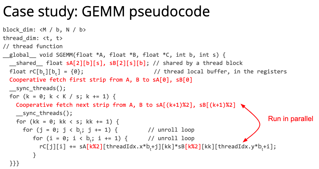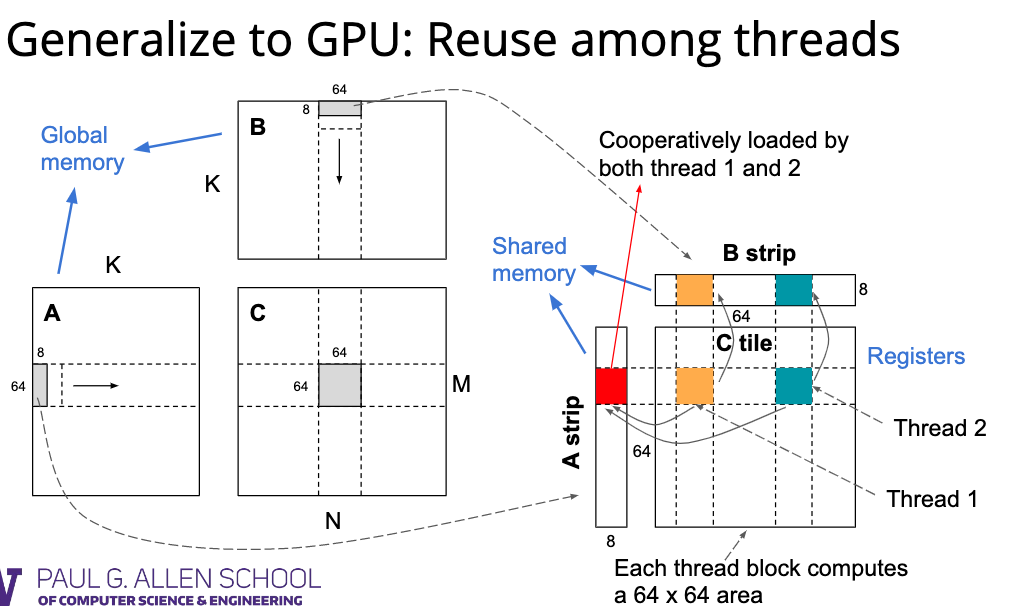 对于 CPU 来说,代码优化可能集中于 Reuse memory 上面,而 GPU 的优化则是集中于 Reuse among threads 上。(这段其实不太懂,我理解就是跟前一讲的那个 window sum 一样,优化复用不同线程的内存)