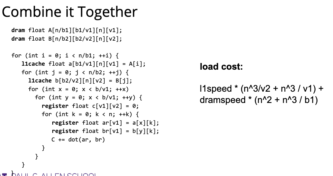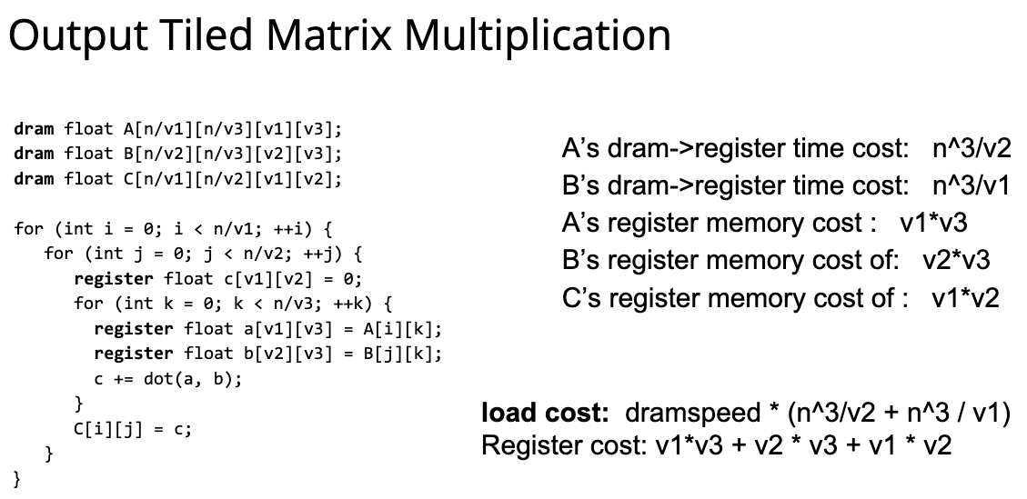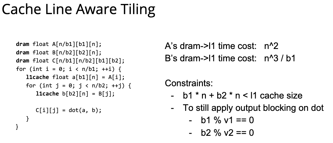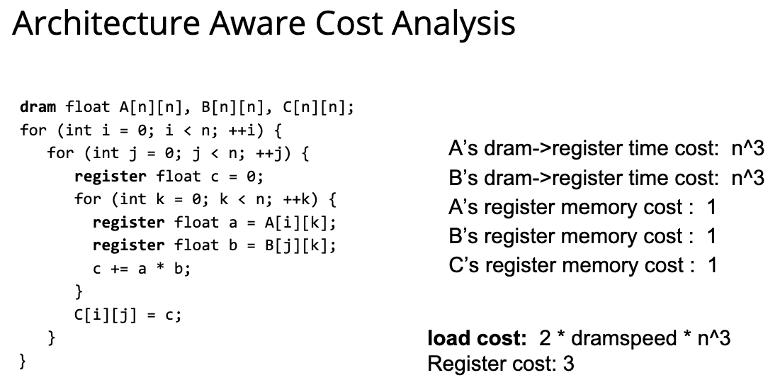 这一讲处于计算图和硬件之间。 首先讲了一些体系结构的基本知识,比如多级 cache 之类的,然后讲了矩阵乘法的 cache 优化,非常基础。 最简单的矩阵乘法如下图所示: