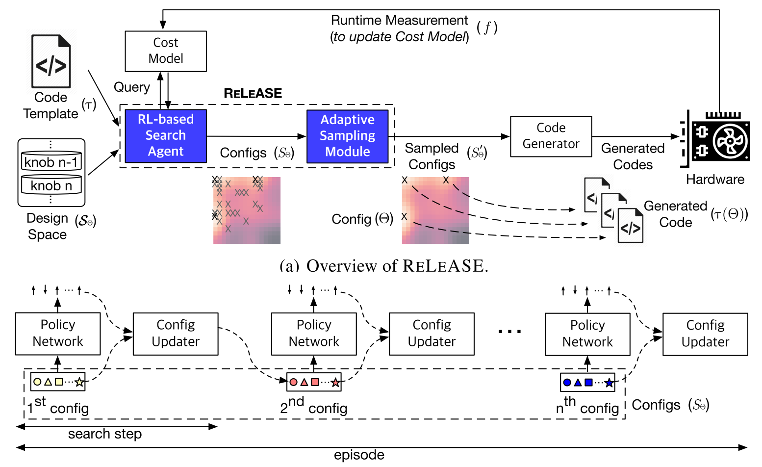 对于目前的优化算法来说,依然存在着许多问题。但是后续的工作并不是特别多。首先可以看一下 Reinforcement Learning and Adaptive Sampling for Optimized DNN Compilation, ICML 2019 Workshop RL4RealLife 这篇文章主要谈到的问题是两点:1. 开发一个更有效的搜索算法(相对于 AutoTVM 的模拟退火) 2. 减少硬件测试的时间。从这篇文章的实验结果来看,第一个目标基本上没有达成,第二个目标完成的还不错。这个第二个目标也是我认为的之后优化的核心问题。 文章的整个框架如下图,主要贡献是两个蓝色的部分——基于强化学习的搜索和自适应采样。