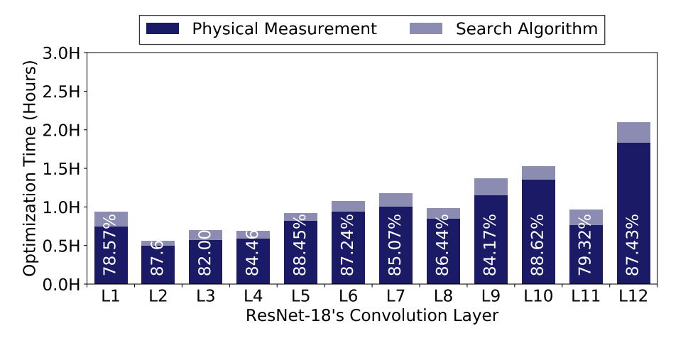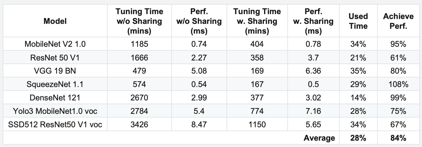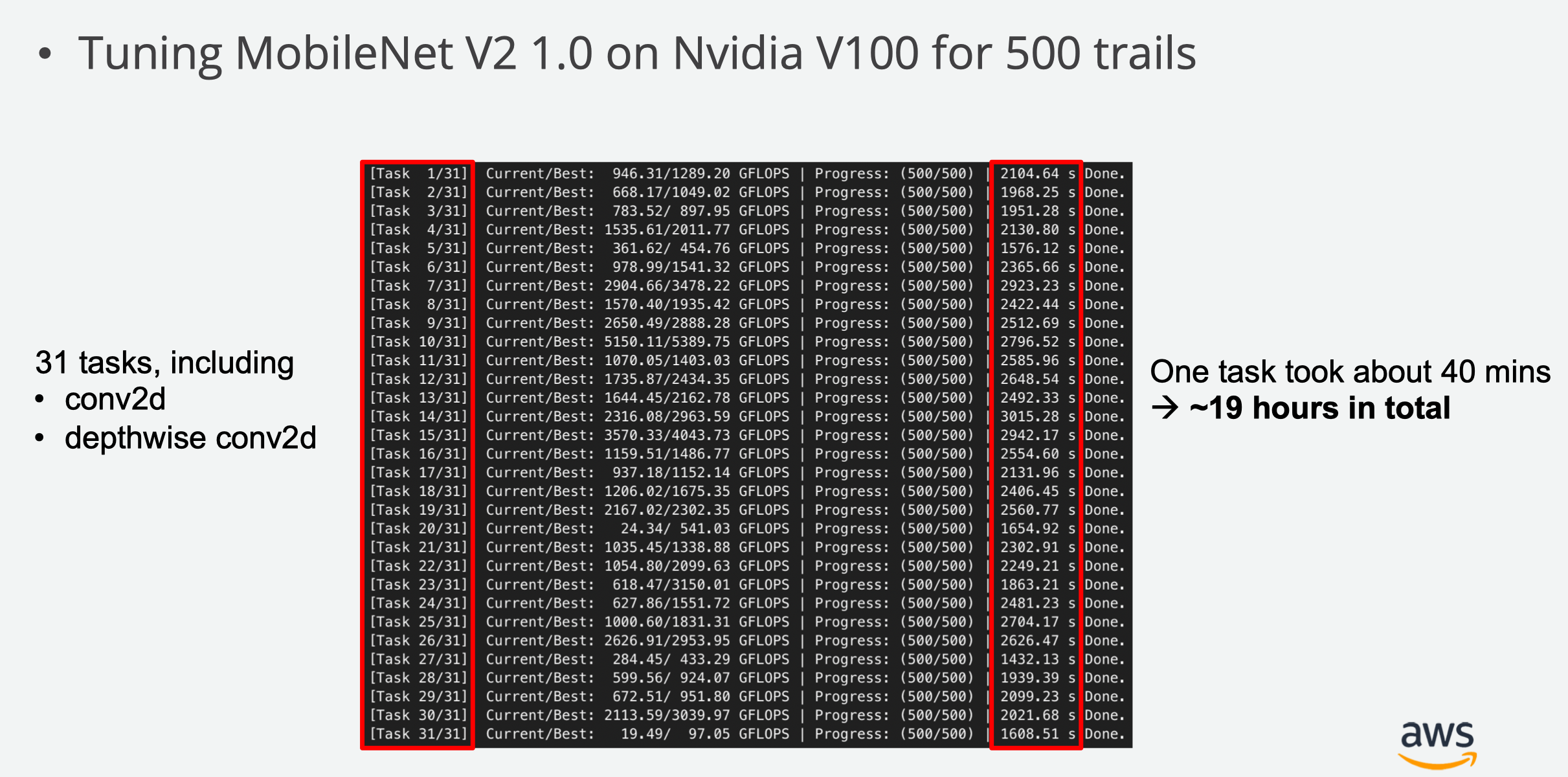 从上面的图中可以看到,tuning 一次 MobileNet,在 V100 上面都要花差不多 19 个小时,非常缓慢。在我们实验室这种显卡上面,大概就要两到三天了。