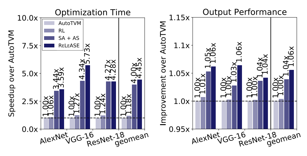 从上面两个图可以看出,第二步自适应采样的动机还是比较强的。因为对于 AutoTVM 来说,大量的时间都用于在硬件上测试算子的运行时间,而且相似的算子 config 确实很多,所以通过聚类然后采样的想法确实比较直接。最后的加速效果也不错: