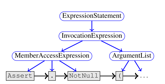 当然,对于第二个任务来说,合法的解可能有好几个,就跟考试的程序填空中有好多正确答案一样。 根据文章的标题,可以想象文章的内容就是把 program 建成一个图,然后在图上面跑 GNN。文章中所采取的的 GNN 是 GGNN (Gated Graph Neural Networks),可能是因为这个 GGNN 比较适合 program 建的图,所以很多后续工作采用的也是这个方法。 图定义为\(G=(V,E,X)\),其中\(V\)是节点、\(X\)是特征,\(E=(E_1,...,E_k)\)是边的集合,边有\(k\)种。 每个节点状态为\(h^{(v)}\),初始状态就是\(x^{v}\)。跟传统的 GNN 一样,每个节点会向外发送\(k\)的类型的消息\(m_k^{(v)}=f_k(h^{v})\),然后每个节点聚合邻居的消息\(\widetilde{m}^{(v)}=g(\{m_k^{(u)}\}\mid{(u,v,k)\in E})\)。 特殊之处在于更新\(h^{(v)}\)的方式,GGNN 用的是 GRU 单元来更新特征向量。\(h^{(v)}=GRU(\widetilde{m}^{(v)},h^{v})\)。这样可以捕捉到一些较远的点对该点的影响。 在该论文中,\(f_k\)是一个线性函数,\(g\)是个简单的求和。 这篇论文中比较炫酷的部分是建图。首先一个程序,自然对应一个 AST,这个 AST 的叶子节点是程序中的 token,中间节点对应着 BNF 的中间节点。因为 GNN 捕捉不了树的儿子的顺序,所以要加一个 NextToken 边来把 token 都串起来:
