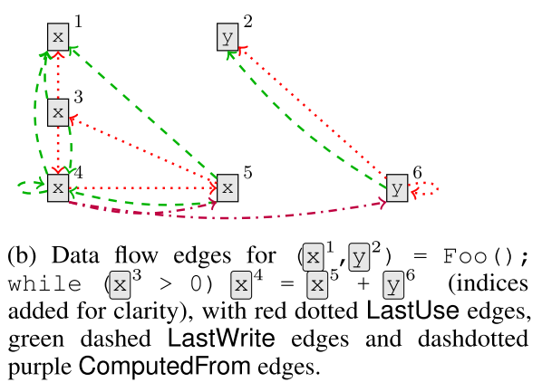 另一方面,我们要捕捉程序的 Data-flow 信息。对于每个变量来说,上一次 read 的位置,连接一个 LastRead 边,因为有分支结构存在,这种边可能有多条。同样,上一次 write 的位置,连接一个 LastWrite 边。有赋值语句存在的时候,左右两边的语句要连接一个 ComputedFrom 边: