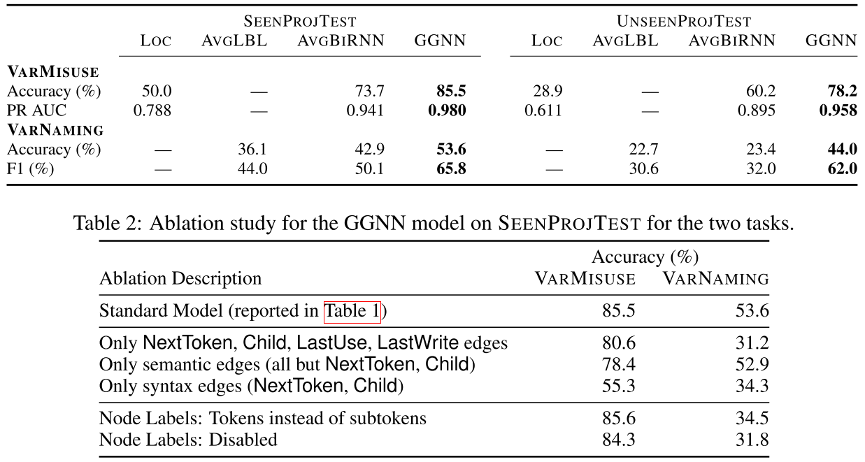 Learning to Represent Programs with Graphs. ICLR 2018 是 GNN 在 Source Code 中运用的比较早的工作,质量也蛮高。 首先定义一下这篇文章要解决的两个问题: 第一个问题叫做 VARNAMING,就是在一段代码中有个匿名的变量,然后要通过这个变量在代码中的行为来对这个变量命名。 第二个问题叫做 VARMISUSE,类似于程序填空,预测一个程序中空缺的 token 是什么。通过这个任务,可以发现代码中一些 misuse 性质的 bug,举例如下: