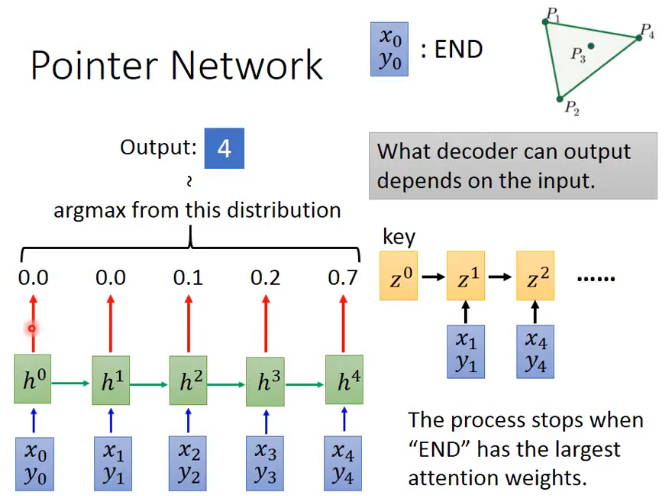 其实也是先分词,然后相同的词搞一个节点而已。初始的特征是节点名字特征跟Cache节点类型本身有个特征进行拼接。节点名字特征用 CharCNN 来计算。 建图层面还是比较简单的,这篇文章主要的贡献之处在于利用 GSC 节点来解决 open vocabulary 的问题。解决的方法在于修改 GNN 最后一步\(y=g(\{h_v^t\})\)中\(g\)的计算方式,灵感来自于 Pointer Network。为了方便之后理解,先简单叙述一下啥是 Pointer Network。 这个 Pointer Network 本来是做组合优化的,最开始用来解决凸包问题。凸包问题我们都知道,输入一个点集,输出一个凸包。但是这个输出的范围其实是跟输入相关的。Pointer Network 用了很简单的机制解决了这个问题: