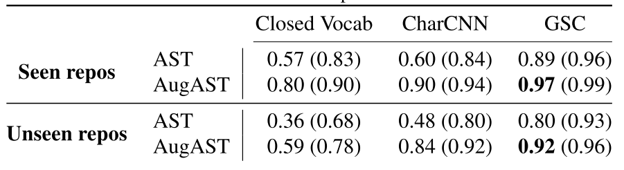 在传统的 attention 中,都是 encoder 和 decoder 的 hidden layer 算个权重,然后组合一下 encoder 的所有权重输入到 decoder 中。这里的输出就直接把 attention 的最大权重作为其中一步的输出,并且输入到 encoder 中继续形成新的 hidden layer。 下面就看看如何利用 GSC 解决 VARMISUSE 的问题。在前一篇文章中,这个 VARMISUSE 问题解决起来其实还是比较复杂的。这篇文章用 Java 项目作为数据集。因为 Java 跟垃圾语言 Python 不一样,是一个要先声明后调用的语言。所以对单独语法槽的预测,都可以变成一个 Pointer Network 问题,指向现存的变量节点。对于 GGNN 来说,简单按照\(y=\sigma(f_1(h_v^t,h_v^0)\odot f_2(h_v^t))\)来计算一下 attention 权重(其实我不太懂这个 attention 为什么跟槽的 embedding 无关,可能是因为 GGNN 论文里面的 readout attention 就是这么做的),挑其中最大的几个作为输出即可。