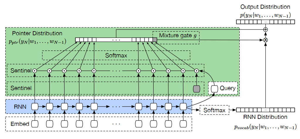 可以看到,加上 GSC 之后效果有一定的提升。 解决 VARNAMING 的思路跟 Pointer Sentinel Mixture Model 非常相似。Pointer Sentinel Mixture Model 就是把纯 attention 求出来的 open vocabulary 分布和正常 attention 求出来的 close vocabulary 分布加到一起,来预测要产生的序列: