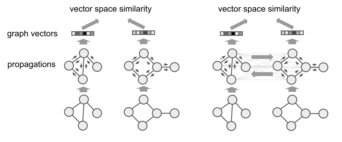 论文中给出两种方式来解决这个问题。第一种是输入一个图输出一个 embedding,通过优化这个 embedding 使得两个相似的图的 embedding 会离得更近。第二种更加直接,输入两个图,输出他们的相似性。这两种方式都是在 GNN 的基础上做的。
