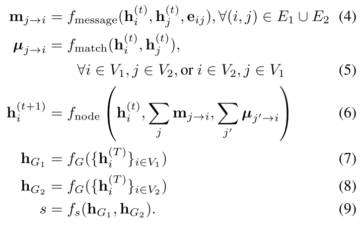 第一种方法计算 embedding 的过程没啥好说的,就是输入\((G_1, G_2)\)输出\((h_{G_1},h_{G_2})\)。重点在于最后的 loss 设计,因为跟第二种可以共用相同的 loss,所以放到一起最后讲。 对于第二种方法,大多数步骤跟 GNN 都是一样的。主要区别在于在聚合邻居信息的时候,也要聚合另一张图的信息 \(\mu\):