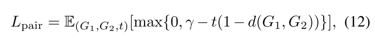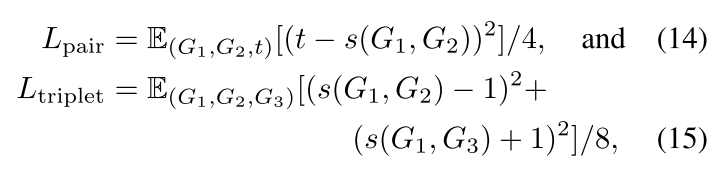 公式\((12)\)可以看做当两个图相似的时候,距离应该小于\(1-\gamma\),当两个图不相似的时候,距离应该大于\(1+\gamma\)。 公式\((13)\)可以看做\(d(G_1,G_2)\lt d(G_1,G_3)-\gamma\)。
