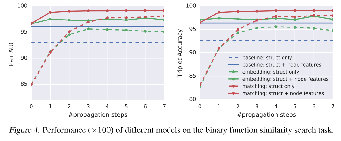 可以看到,效果有一定的提升。这里的 baseline 是 Google 的一个二进制代码查询工具,利用手工构造的图 hash 来寻找相同的代码。