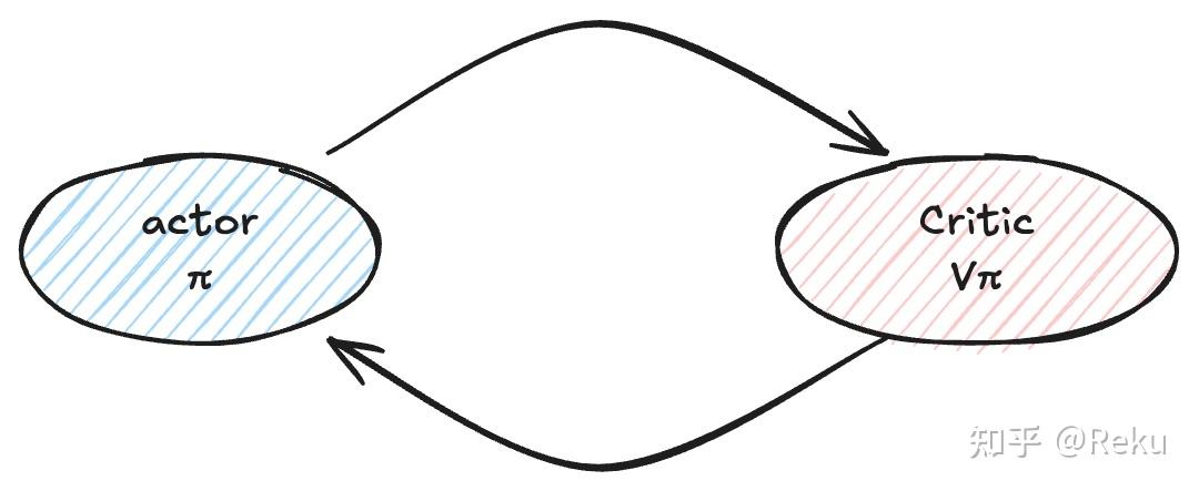 基础的强化学习分成两个角色,actor \(\pi\) 和critic \(V_{\pi}\) 。其中actor代表的就是agent,基于环境的状态和奖励能够做出决策;critic类似教师,基于当前的环境状态和actor的水平,判断一下这个状态的价值。有一点很关键,critic是『因材施教』的,critic的输出一定是针对当前的actor而言的。