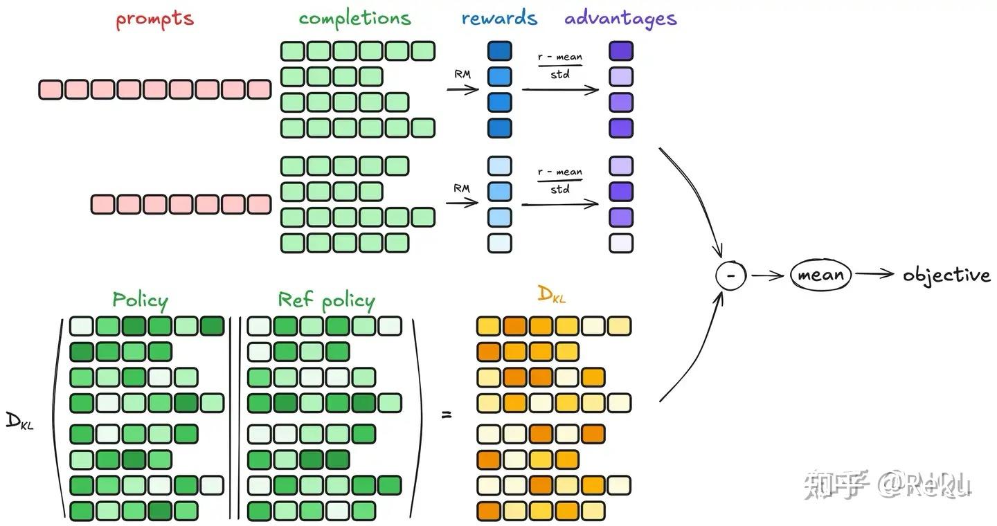 GRPO因为deepseek成为了现在最火爆的强化学习算法。AIQL大神的回答里有个神图:
