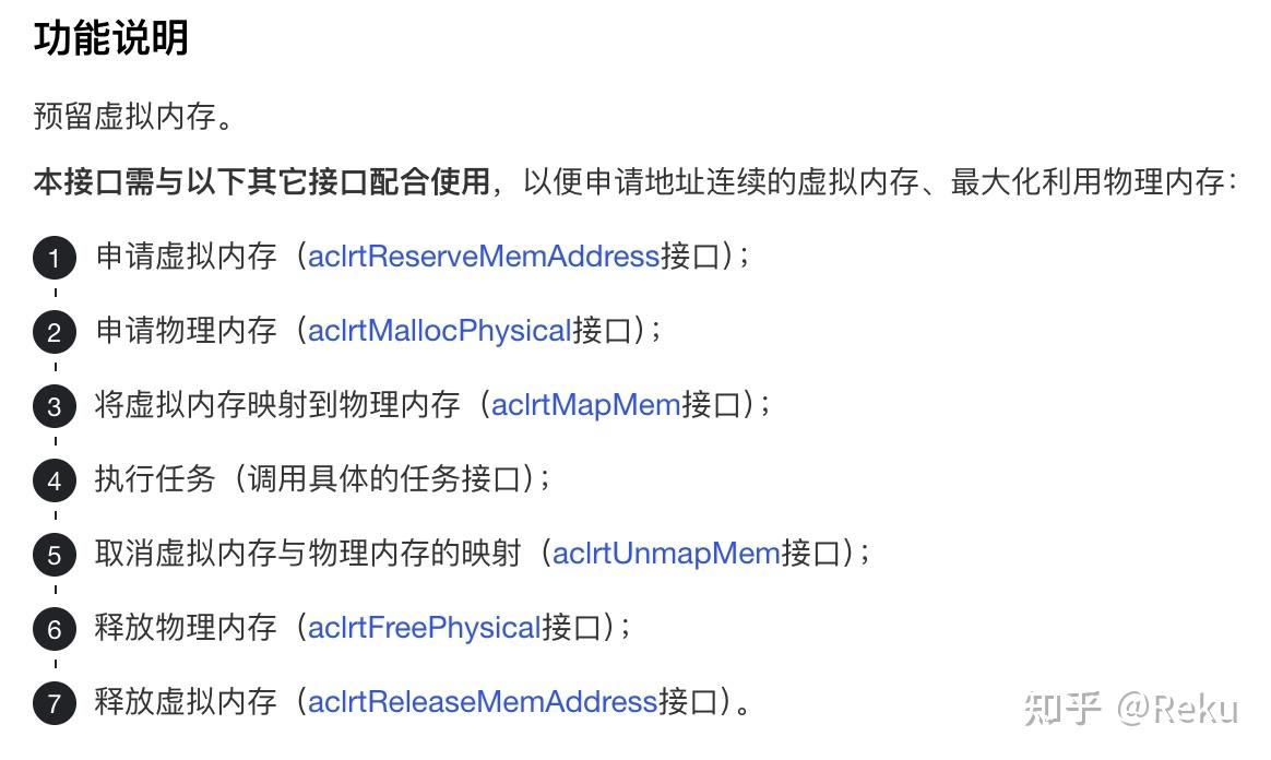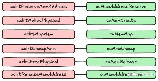 CUDA和AscendCL都支持虚拟内存管理。两个硬件的API也基本是对齐的,以AscendCL为例,大概需要这么几个API: