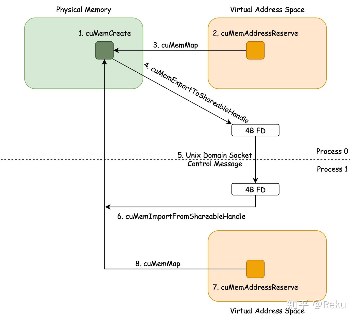 1 2 3 1. VMM 分配 (cuMemCreate + cuMemMap + cuMemSetAccess) 2. 交换 IPC handle(Unix Domain Socket) 3. 映射远端内存(cuMemImportFromShareableHandle + cuMemMap)